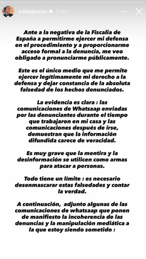 Η ανάρτηση έρχεται να προστεθεί σε όσα είχε δηλώσει ο Ιγκλέσιας στις 16 Ιανουαρίου μέσω Instagram, όταν είχε εκδώσει επείγουσα ανακοίνωση αρνούμενος τις κατηγορίες που αφορούν περιστατικά του 2021 στις κατοικίες του στην Πούντα Κάνα και τις Μπαχάμες.