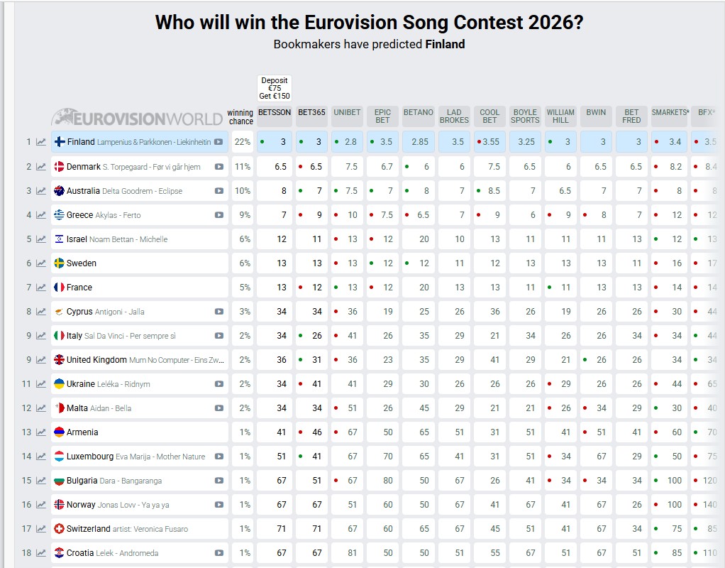 Ξεκάθαρο φαβορί για τη νίκη στη Eurovision 2026 είναι η Φινλανδία, με το «Liekinheitin» των Λίντα Λαμπένιους και Πέτε Πάρκονεν. Αρχικά έδειχνε να βρίσκεται κοντά με τους αντιπάλους του, όμως μέσα σε λίγα 24ωρα διπλασίασε τη διαφορά από τη δεύτερη θέση.