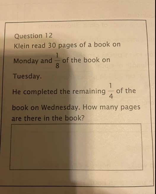 Συγκεκριμένα αναφέρει: «Ο Klein διάβασε 30 σελίδες ενός βιβλίου τη Δευτέρα και το 1/8 του βιβλίου την Τρίτη. Ολοκλήρωσε το υπόλοιπο 1/4 του βιβλίου την Τετάρτη. Από πόσες σελίδες αποτελείται το βιβλίο;».