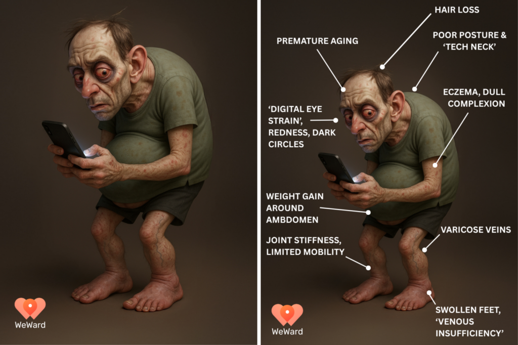 Στη συνέχεια, οι ερευνητές μελέτησαν τις βασικές επιπτώσεις που έχουν τόσο ο καθιστικός τρόπος ζωής όσο και η υπερβολική χρήση οθονών στην εμφάνιση και τη γενικότερη υγεία του ανθρώπου — και μετέτρεψαν τα ευρήματά τους σε μια οπτική απεικόνιση μέσω τεχνητής νοημοσύνης.