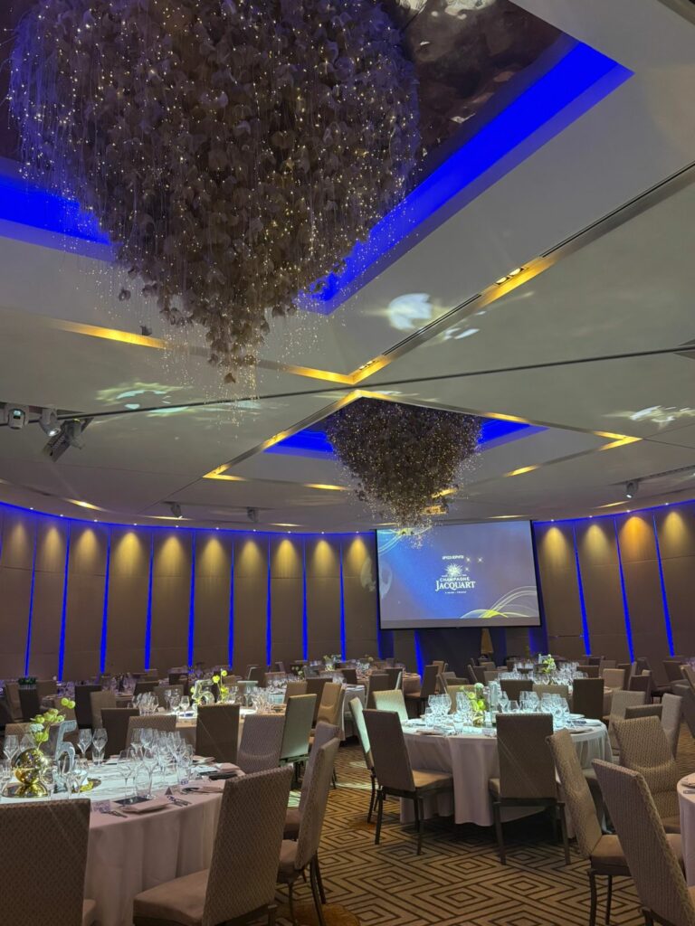 Το εξαιρετικά διαμορφωμένο για τη βραδιά «Grand Ballroom» του «Four Seasons», είναι έτοιμο για την αποψινή λαμπερή τελετή απονομής των γαστρονομικών βραβείων, «Χρυσοί Σκούφοι Κύπρου 2025», που συνδιοργανώνουν το αθηνόραμα και Ο Φιλελεύθερος. Το χαλί που θα υποδεχθεί τους εκλεκτούς καλεσμένους – προσωπικότητες από το χώρο της πολιτικής, των τεχνών και των γραμμάτων, των επιχειρήσεων, των μέσων ενημέρωσης και, φυσικά, τους βραβευόμενους- και θα τους οδηγήσει στο χώρο της εκδήλωσης στρώθηκε. Οι ροτόντες ντύθηκαν στα λευκά τραπεζομάντηλα, τα ποτήρια και τα μαχαιροπήρουνα πήραν τη θέση τους. Οι τελευταίες πινελιές στον διάκοσμο μπήκαν κι αυτές. Η art de la table ολοκληρώθηκε με την τοποθέτηση του center piece, που φέτος είναι μία εντυπωσιακή δημιουργία με τον συμβολικό αριθμό «5», αφιερωμένο στις πέντε επιτυχημένες διοργανώσεις των Χρυσών Σκούφων Κύπρου.