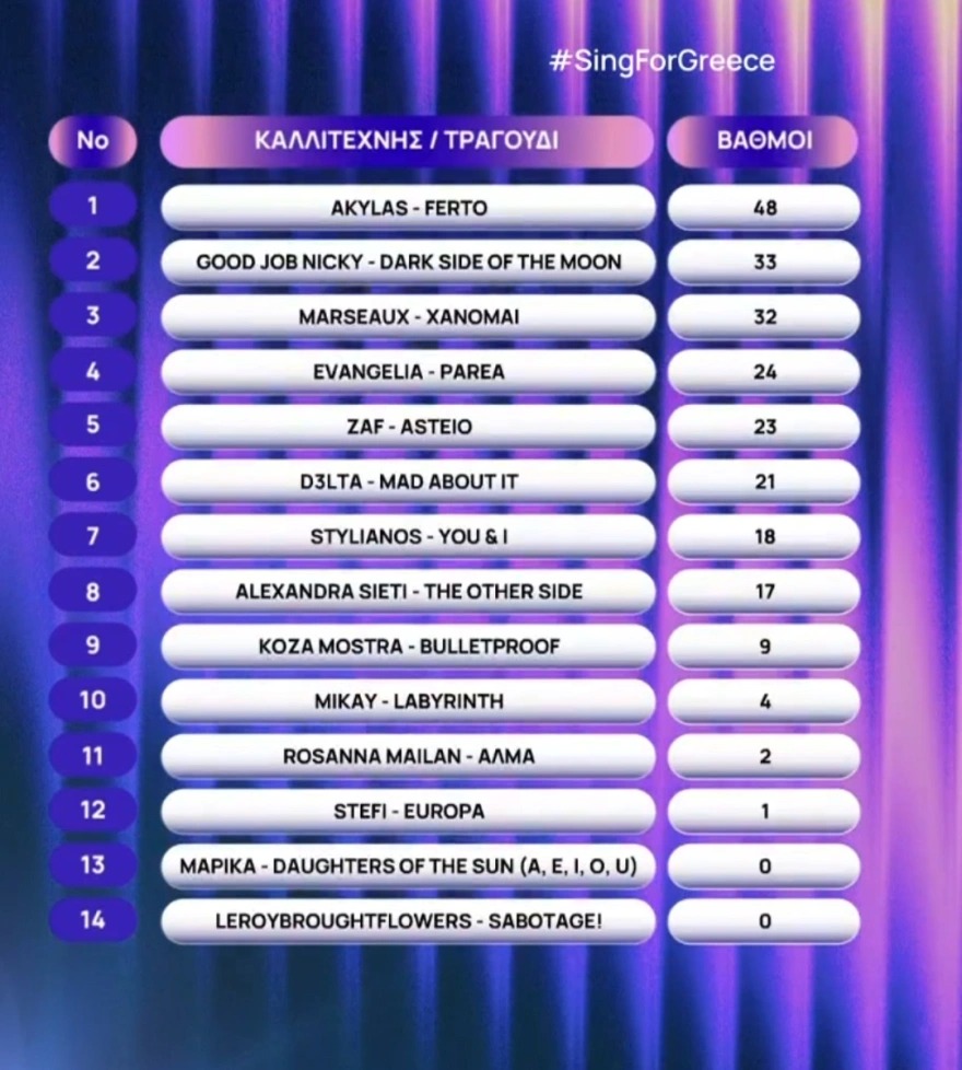 Ο Akylas είναι ο μεγάλος νικητής του ελληνικού τελικού για τη Eurovision 2026, καθώς το «Ferto» πήρε το εισιτήριο για τη Βιέννη, όπου θα διεξαχθεί ο 70ός μουσικός διαγωνισμός. Το τραγούδι, που από την αρχή της διαδικασίας εμφανιζόταν ως το μεγάλο φαβορί, επικράτησε με 48 βαθμούς μετά τον συνδυασμό της ψήφου του κοινού και της βαθμολογίας των δύο κριτικών επιτροπών – της ελληνικής και της διεθνούς – ανάμεσα σε 14 υποψηφιότητες που διεκδίκησαν τη νίκη στη βραδιά του Μεγάλου Τελικού.