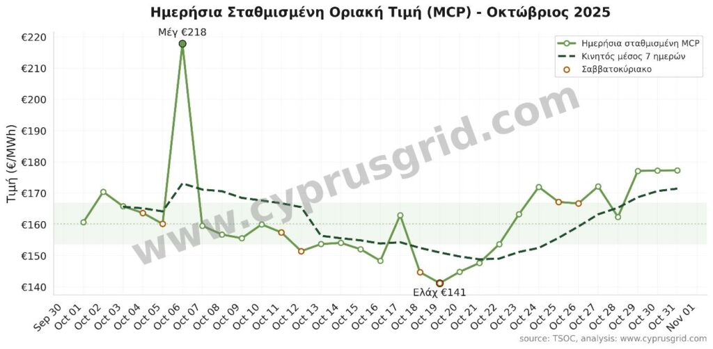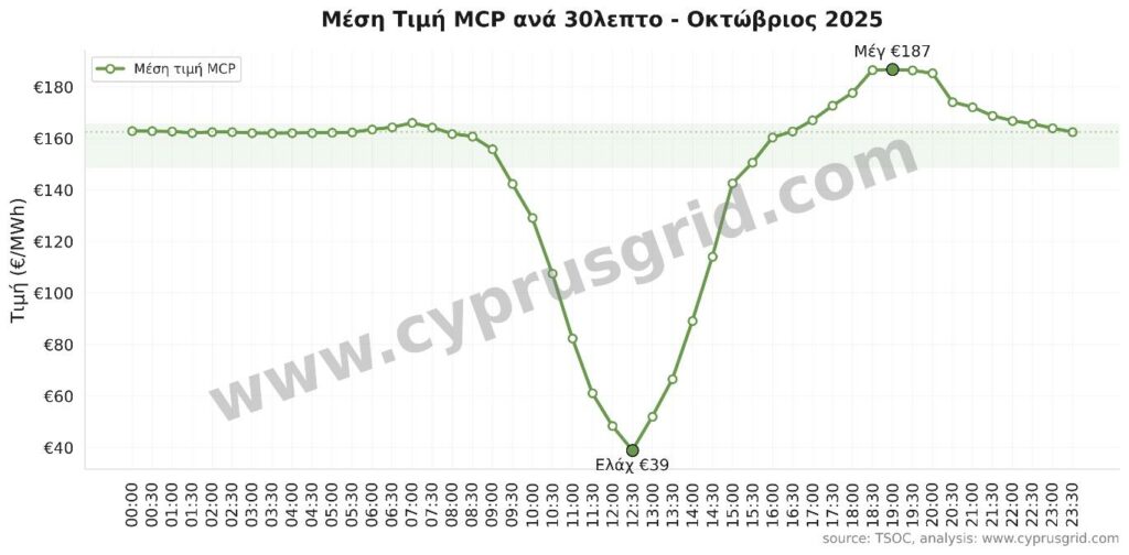Σχεδόν 5% όλων των περιόδων εμπορίας εμφάνισαν μηδενικές τιμές, ενώ σε 42% των ημερών του Οκτωβρίου σημειώθηκαν μηδενικές ή σχεδόν μηδενικές τιμές στις μεσημβρινές ώρες (11:00–14:00). Αντίθετα, η μέση τιμή τη νύχτα (18:00–06:30) διαμορφώθηκε στα €163/MWh.