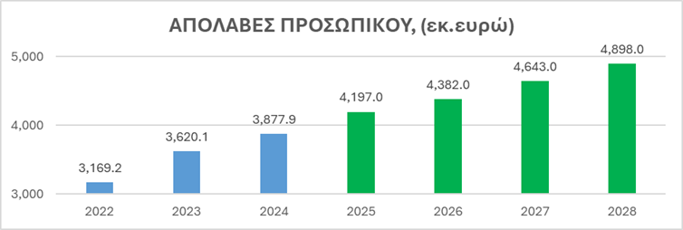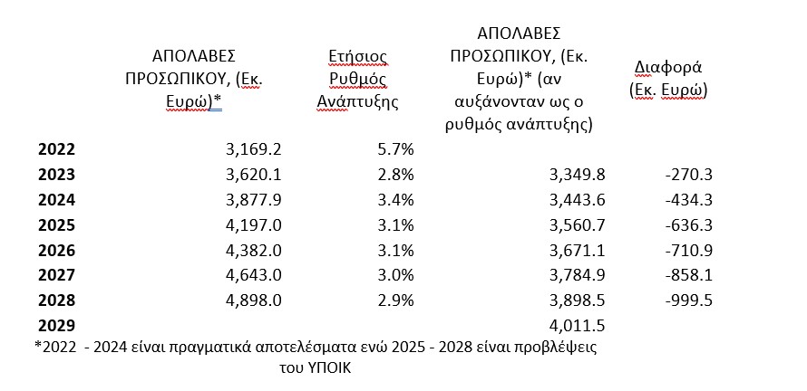 Με βάση τις προβλέψεις του ίδιου του Υπουργείου Οικονομικών, το κρατικό μισθολόγιο αναμένεται να φτάσει τα €4.898 εκ. το 2028. Δηλαδή αύξηση €1.729 εκ. σε πέντε χρόνια, ή 54%. Αυτό δεν είναι βιώσιμο. Με άλλα λόγια, η αύξηση στο κρατικό μισθολόγιο που θα γίνει σε αυτή την 5ετία, θα είναι 4 φορές μεγαλύτερη από ό,τι ήταν η αύξηση που παρατηρήθηκε στο διάστημα 2008 – 2012, όταν και οδηγηθήκαμε σε μνημόνιο.