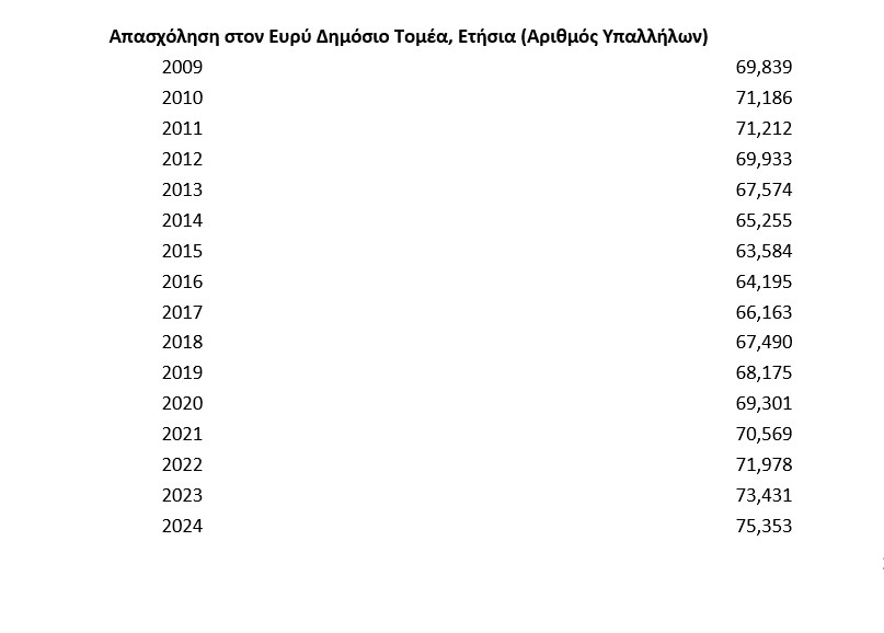 Αντί αυτού, αυξάνεται την ίδια στιγμή και ο αριθμός των εργαζομένων στον ευρύτερο δημόσιο τομέα. Από το τέλος του 2022 μέχρι το τέλος του 2024, η απασχόληση αυξήθηκε κατά 3.375 άτομα, σχεδόν 5%.