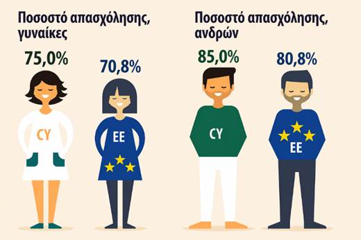 Η Κύπρος σημειώνει υψηλά ποσοστά απασχόλησης, τόσο στους άνδρες (85,0%) όσο και στις γυναίκες (75,0%), υπερβαίνοντας σημαντικά τον μέσο όρο της Ευρωπαϊκής Ένωσης (80,8% για τους άνδρες και 70,8% για τις γυναίκες). Το στοιχείο αυτό αναδεικνύει τη δυναμική συμμετοχή του κυπριακού πληθυσμού στον τομέα της απασχόλησης.