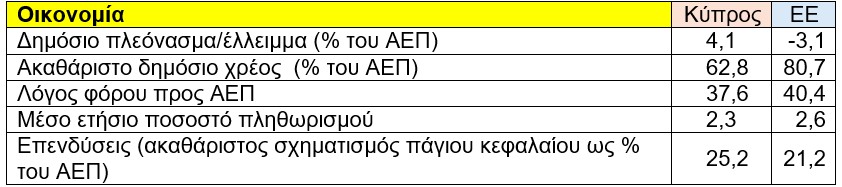 Η Κύπρος ξεχωρίζει για τη δημοσιονομική της επίδοση, καταγράφοντας Δημόσιο πλεόνασμα ύψους 4,1% του Ακαθάριστου Εγχώριου Προϊόντος (ΑΕΠ), τη στιγμή που η Ευρωπαϊκή Ένωση στο σύνολό της εμφανίζει έλλειμμα (-3,1%). Παράλληλα, το ακαθάριστο δημόσιο χρέος παραμένει σημαντικά χαμηλότερο από τον ευρωπαϊκό μέσο όρο, στοιχείο που ενισχύει την εικόνα μακροοικονομικής σταθερότητας.