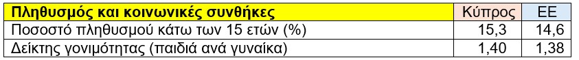 Ιδιαίτερα θετικό στοιχείο για την Κύπρο αποτελεί το γεγονός ότι το ποσοστό του πληθυσμού κάτω των 15 ετών ανέρχεται σε 15,3%, το οποίο είναι υψηλότερο από τον μέσο όρο της Ευρωπαϊκής Ένωσης (14,6%). Επίσης, ο δείκτης γονιμότητας ανέρχεται σε 1,4 παιδιά ανά γυναίκα, επίσης πάνω από τον μέσο όρο της ΕΕ (1,38).
