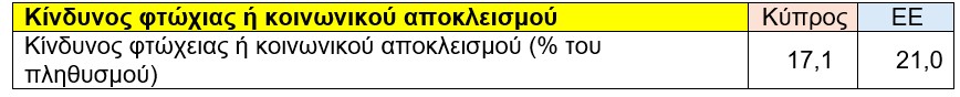 Σύμφωνα με τα διαθέσιμα στοιχεία, το ποσοστό του πληθυσμού που βρίσκεται σε κίνδυνο φτώχειας ή κοινωνικού αποκλεισμού στην Κύπρο ανέρχεται στο 17,1%, ενώ στην Ευρωπαϊκή Ένωση το αντίστοιχο ποσοστό είναι υψηλότερο, φτάνοντας το 21,0%.