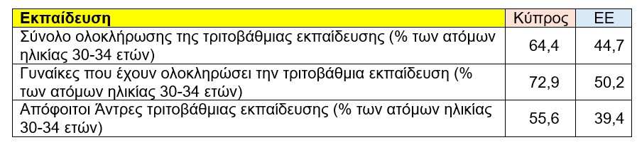Η Κύπρος καταγράφει εξαιρετικά υψηλές επιδόσεις στην τριτοβάθμια εκπαίδευση. Αξιοσημείωτο είναι ότι το 64,4% των ατόμων ηλικίας 30–34 ετών έχουν ολοκληρώσει σπουδές τριτοβάθμιας εκπαίδευσης, έναντι μόλις 44,7% στην Ευρωπαϊκή Ένωση, γεγονός που αναδεικνύει το υψηλό επίπεδο μόρφωσης του πληθυσμού.