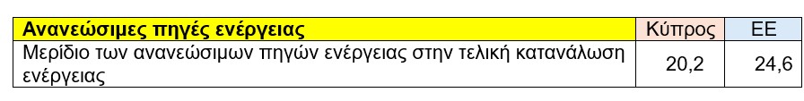 Η Κύπρος έχει σημειώσει σημαντική πρόοδο στη μετάβαση προς ανανεώσιμες πηγές ενέργειας, με το μερίδιο των ανανεώσιμων πηγών στην τελική κατανάλωση ενέργειας να φτάνει στο 20,2%. Παρά το γεγονός ότι ο ευρωπαϊκός μέσος όρος είναι λίγο υψηλότερος, στο 24,6%, η Κύπρος κινείται με σταθερά βήματα προς έναν πιο βιώσιμο προσανατολισμό.