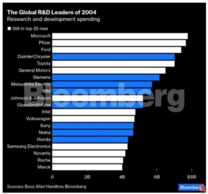 Αυτό το προφίλ αφορά την τεχνολογία, τα φαρμακευτικά προϊόντα ή την αυτοκινητοβιομηχανία. Αυτό ισχύει εδώ και δεκαετίες. Ο αριθμός των εταιρειών τεχνολογίας έχει αυξηθεί, με τις σχετικά νεοεισερχόμενες Amazon, τη μητρική της Google, Alphabet και τη μητρική του Facebook, Meta Platforms, να καταλαμβάνουν πλέον τις τρεις πρώτες θέσεις και τις περισσότερες από τις κινεζικές εταιρείες να είναι νέες στη λίστα. Ωστόσο, όταν βρήκα μια κατάταξη των top 20 από το 2004, την οποία είχε συντάξει ο Booz Allen Hamilton από τα δεδομένα του Bloomberg, εντυπωσιάστηκα από το πόσα γνωστά ονόματα περιείχε.
