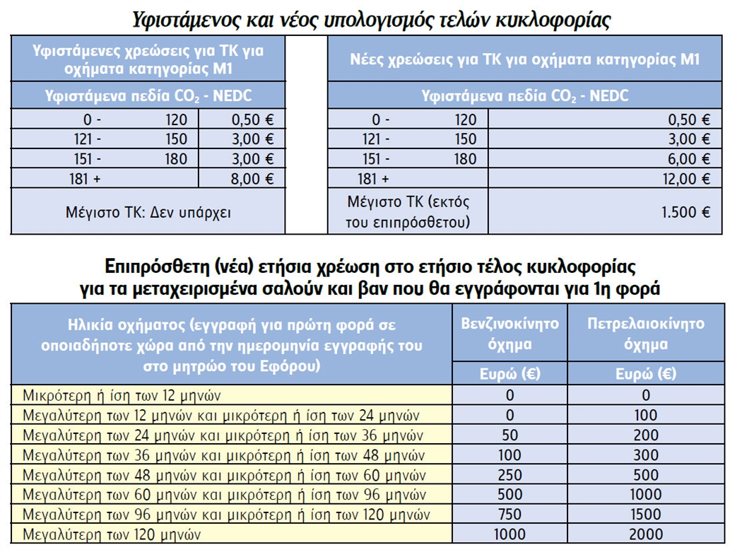 Για τα υφιστάμενα, εγγεγραμμένα οχήματα, θα ισχύουν τα υφιστάμενα τέλη.
