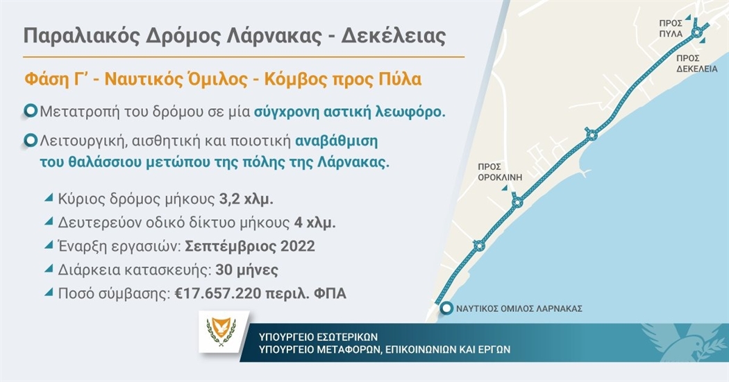 Υπογράφτηκε σήμερα, 13 Ιουλίου 2022, το Συμβόλαιο για την εκτέλεση του έργου «Βελτίωση παραλιακού δρόμου Λάρνακας – Δεκέλειας, Φάση Γ’ (Τμήμα από τον Ναυτικό Όμιλο μέχρι τον κόμβο προς Πύλα)». Το Συμβόλαιο υπέγραψαν, παρουσία των Υπουργών Μεταφορών, Επικοινωνιών και Έργων κ. Γιάννη Καρούσου και Εσωτερικών κ. Νίκου Νουρή, η Αν. Διευθύντρια του Τμήματος Δημοσίων Έργων κα Ελένη Κασκίρη, εκ μέρους της Κυβέρνησης, και ο κ. Γιώργος Ιακώβου, εκ μέρους της Εταιρείας “Iacovou Brothers (Constructions) Ltd”. Το Έργο βρίσκεται στην Επαρχία Λάρνακας επί του παραλιακού σρόμου Λάρνακας – Δεκέλειας. Τα όρια του έργου είναι από τον υφιστάμενο κυκλικό κόμβο κοντά στον Ναυτικό Όμιλο Λάρνακας μέχρι τον κόμβο που οδηγεί στην Πύλα. Το κύριο οδικό δίκτυο (μήκους περίπου 3,5 χλμ) περιλαμβάνει τέσσερις λωρίδες κυκλοφορίας (δύο ανά κατεύθυνση), κτιστή κεντρική διαχωριστική νησίδα, πλακόστρωτα πεζοδρόμια, ποδηλατοδρόμους, λωρίδες πρασίνου, χώρους πρασίνου, φωτοελεγχόμενες διαβάσεις πεζών τύπου “Pelican”, στάσεις λεωφορείων, παρόδιους χώρους στάθμευσης και τέσσερις ισόπεδους κυκλικούς κόμβους. Το δευτερεύον οδικό δίκτυο (υπηρεσιακοί δρόμοι μήκους περίπου 4 χλμ) περιλαμβάνει μια ή δύο λωρίδες κυκλοφορίας, πλακόστρωτα πεζοδρόμια, παρόδιους χώρους στάθμευσης, χώρους πρασίνου, διαβάσεις πεζών τύπου “Zebra” και υπερυψωμένες συμβολές. Το Έργο προγραμματίζεται να αρχίσει τον Σεπτέμβριο 2022, με διάρκεια εκτέλεσης 30 μήνες και κόστος €17.657.220,00 συμπεριλαμβανομένου του ΦΠΑ. Μιλώντας κατά την τελετή υπογραφής του Συμβολαίου, ο κ. Καρούσος επεσήμανε ότι το έργο αποτελεί άλλη μια εξαγγελία του Πρόεδρου της Δημοκρατίας για την αναβάθμιση της Επαρχίας Λάρνακας, που πλέον να οδεύει σταδιακά προς ολοκλήρωση. «Το έργο αυτό είναι ψηλά στις προτεραιότητες της Κυβέρνησης, καθώς πέραν του άμεσου οφέλους για την Επαρχία Λάρνακας, θα διευκολύνει τη διακίνηση όλων των πολιτών και των επισκεπτών της Κύπρου», σημείωσε ο Υπουργός Μεταφορών. Όπως είπε ο κ. Καρούσος, ο δρόμος Λάρνακας – Δεκέλειας «αποτελεί μέρος του ευρύτερου σχεδιασμού της Κυβέρνησης για τη βελτίωση των υποδομών της Επαρχίας Λάρνακας και συνδέεται άμεσα με την υλοποίηση του Σχεδίου Βιώσιμης Αστικής Κινητικότητας Λάρνακας, το οποίο βρίσκεται στο στάδιο της μελέτης και περιλαμβάνει, ανάμεσα σε άλλα, λεωφορειολωρίδες, προδηλατόδρομους και βελτιωτικά έργα για ενίσχυση της ασφάλειας κυκλοφορίας». Παράλληλα, ο Υπουργός Μεταφορών αναφέρθηκε στην υλοποίηση άλλων μεγάλων έργων στην Λάρνακα που στοχεύουν στον εκσυγχρονισμό της Επαρχίας και τη αναβάθμισή της σε έναν ελκυστικό προορισμό για επενδύσεις και τουρισμό. Ενδεικτικά, ο κ. Καρούσος αναφέρθηκε στη μετακίνηση των εγκαταστάσεων των πετρελαιοειδών από την περιοχή, αλλά και την υπό εξέλιξη ανάπλαση και κατασκευή του Λιμανιού και της Μαρίνας Λάρνακας, τη μεγαλύτερη επένδυση με προϋπολογισμό που φτάνει τα 1,2 δις ευρώ. «Τα έργα που ανέφερα αποτελούν μόνο μερικές από τις δράσεις της Κυβέρνησης για την Επαρχία Λάρνακας. Στόχος μας είναι, με την εκπόνηση αναπτυξιακών έργων να προσδώσουμε έναν νέο και σύγχρονο χαρακτήρα στην Λάρνακα, συμβάλλοντας στη βελτίωση της ποιότητας ζωής των κατοίκων και την αναβάθμιση της εμπορικής και της τουριστικής ανάπτυξης της Επαρχίας», υπογράμμισε, τέλος, ο Υπουργός Μεταφορών, Επικοινωνιών και Έργων. Στον χαιρετισμό του, ο κ. Νουρής ανέφερε ότι «Το όραμα του Υ