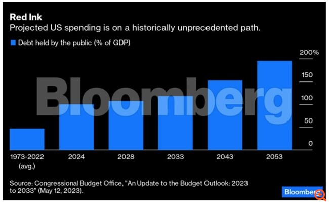 Το σωρευτικό έλλειμμα τα επόμενα 10 χρόνια αναμένεται να φτάσει περίπου τα 20 τρισεκατομμύρια δολάρια – και η συμφωνία για το ανώτατο όριο χρέους μπορεί να μειώσει μόλις κατά 1,5 τρισεκατομμύρια δολάρια αυτό το σύνολο. Ο λόγος του δημόσιου χρέους προς το ΑΕΠ θα συνεχίσει να ανέρχεται, αγγίζοντας το 115% περίπου το 2033. Από εκεί και πέρα, θα συνεχίσει να αυξάνεται. Μέχρι τα μέσα του αιώνα, σύμφωνα με τις παραδοχές του “ισχύοντος κανόνα” του CBO, το χρέος θα κατευθύνεται προς το 200% του ΑΕΠ.