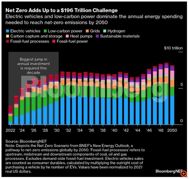 Η Bloomberg NEF, ερευνητική ομάδα του Bloomberg για την πράσινη ενέργεια, εκτιμά σε μια νέα έκθεσή της αυτή την εβδομάδα ότι θα μπορούσε να κοστίσει περί τα 196 τρισεκατομμύρια δολάρια σε επενδύσεις το να μηδενιστούν οι παγκόσμιες εκπομπές άνθρακα έως το 2050, όπως έχουν δεσμευτεί να κάνουν πολλές χώρες, προκειμένου να αποφύγουν την καταστροφή της παγκόσμιας υπερθέρμανσης.