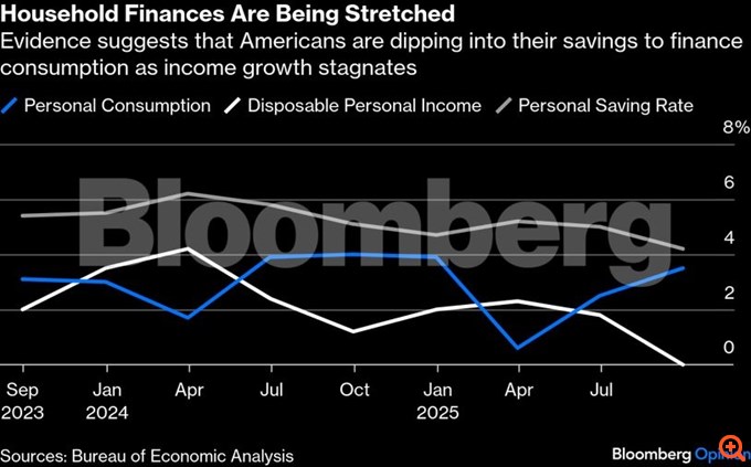 Τι γίνεται όμως με την έκθεση για το ΑΕΠ του γ’ τριμήνου, η οποία έδειξε ότι η οικονομία αναπτύχθηκε με ετήσιο ρυθμό 4,3%, ξεπερνώντας τη μέση εκτίμηση των οικονομολόγων; Ας σκεφτούμε τα ανησυχητικά εσωτερικά στοιχεία. Το κέρδος τροφοδοτήθηκε από μία αύξηση 3,5% στην προσωπική κατανάλωση, ενώ τα πραγματικά διαθέσιμα εισοδήματα παρέμειναν αμετάβλητα. Μία τέτοια απόκλιση υποδηλώνει ότι τα νοικοκυριά ξοδεύουν χρήματα από τις αποταμιεύσεις τους για να τα βγάλουν πέρα. Αυτό δεν μπορεί να διαρκέσει πολύ. Στην πραγματικότητα, το ποσοστό προσωπικής αποταμίευσης έχει μειωθεί στο 4%, το χαμηλότερο από το 2022, όταν ο πληθωρισμός μαινόταν.