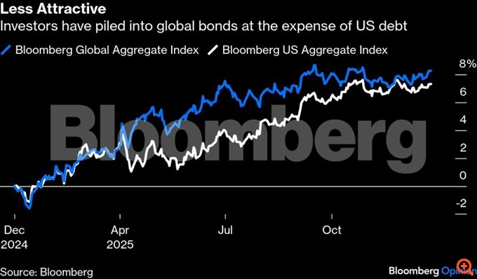 Στην αγορά ομολόγων, οι αποδόσεις από τα αμερικανικά περιουσιακά στοιχεία σταθερού εισοδήματος ήταν χαμηλότερες από ό,τι σε παγκόσμιο επίπεδο. Παρά το γεγονός ότι η Κεντρική Ομοσπονδιακή Τράπεζα των ΗΠΑ μείωσε τα επιτόκια τρεις φορές από τα μέσα Σεπτεμβρίου, οι επενδυτές έκαναν το ασυνήθιστο βήμα να αυξήσουν τις μακροπρόθεσμες αποδόσεις εν μέσω ανησυχίας για μια πιθανή επιτάχυνση του πληθωρισμού. Ως αποτέλεσμα, ο δείκτης Bloomberg US Aggregate (που παρακολουθεί τις αποδόσεις των παγκόσμιων ομολόγων) αυξήθηκε κατά 7,30% το 2025, υστερώντας σε σχέση με το κέρδος 8,17% του δείκτη Bloomberg Global Aggregate.