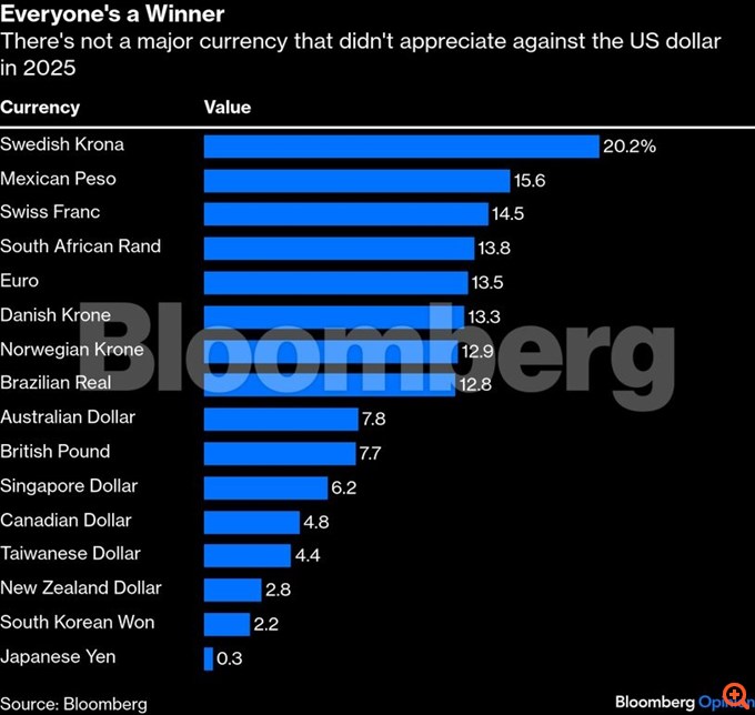 Το νόμισμα μία χώρας δεν διαφέρει πολύ από την τιμή της μετοχής μίας εταιρείας, καθώς είναι πιθανότατα ο καλύτερος δείκτης ψυχολογίας. Αν ναι, οι ΗΠΑ αντιμετωπίζουν προβλήματα. Ο δείκτης Bloomberg Dollar Spot, ο οποίος μετρά το νόμισμα έναντι των κύριων ανταγωνιστών του, μειώθηκε κατά περίπου 8%, γνωρίζοντας τις χειρότερες επιδόσεις από το 2017 – το πρώτο έτος της πρώτης θητείας του Τραμπ. Το δολάριο υποτιμήθηκε έναντι και των 16 πιο διαπραγματεύσιμων νομισμάτων στον κόσμο, όπως καταγράφει το Bloomberg, σε μία ξεκάθαρη ένδειξη ότι οι επενδυτές αντιδρούν στις πολιτικές της κυβέρνησης Τραμπ.