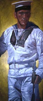Ρεαλιστική ανδρική μορφή του Ανδρέα Κάραγιαν με έμφαση στη φυσιογνωμική απόδοση και τη μνημειακή παρουσία της φιγούρας. Η δεξιοτεχνική χρήση του φωτός και η αντίθεση του λευκού ενδύματος με το θερμό φόντο αναδεικνύουν τον όγκο και τη δομή της σύνθεσης. Έργο με ξεκάθαρη ζωγραφική αξία και υψηλή ζήτηση μεταξύ συλλεκτών, εκτιμώμενο στα €3.000–4.000.
