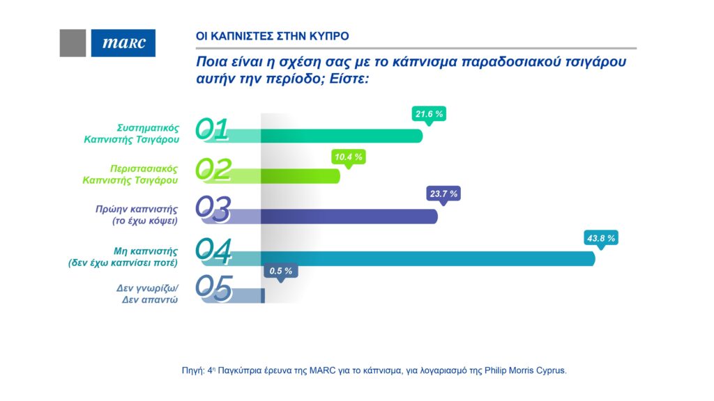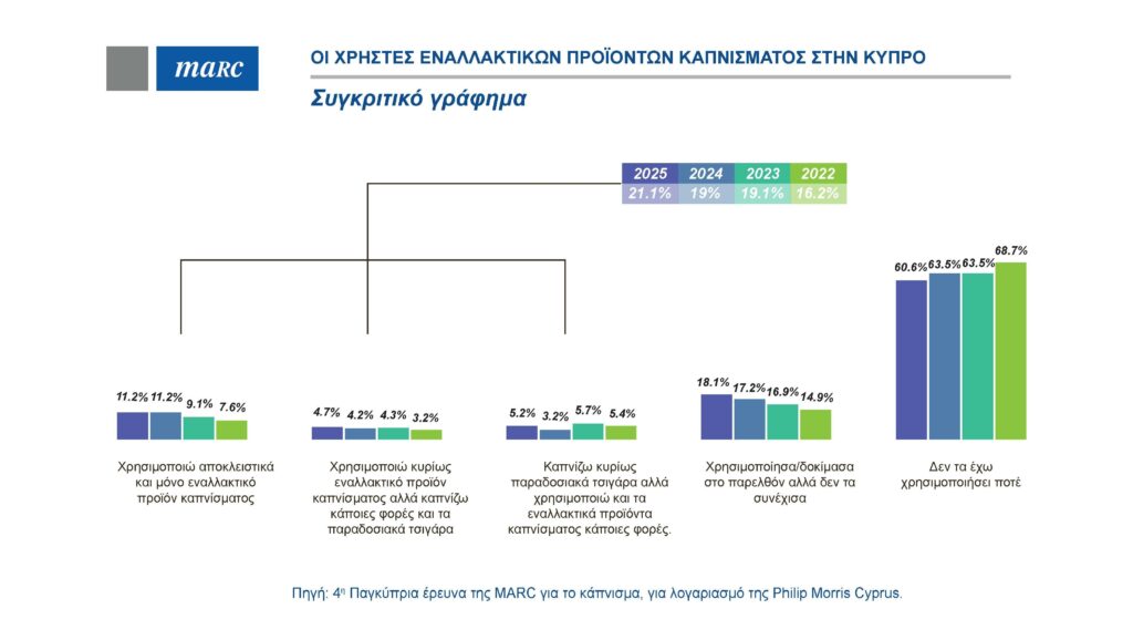 Σύμφωνα με την έρευνα, 3 στους 10 Κύπριους, (32%) εξακολουθούν να καπνίζουν. Ένα πολύ σημαντικό ποσοστό των καπνιστών, (76,6%) δηλώνει ότι δεν έχει επαρκή πληροφόρηση για τα εναλλακτικά, του καπνίσματος τσιγάρου, προϊόντα. Η ανάγκη για τεκμηριωμένη ενημέρωση εξακολουθεί να αποτελεί το κεντρικό ζητούμενο, καθώς 8 στους 10, (84%) θεωρούν ότι η επιστήμη και η τεχνολογία θα πρέπει να λαμβάνεται σοβαρά υπόψη στην επιλογή του σωστού εναλλακτικού προϊόντος. Την ίδια στιγμή, 6 στους 10 ερωτηθέντες, (63%) πιστεύουν ότι τα προϊόντα καπνού και νικοτίνης θα πρέπει να φορολογούνται ανάλογα με τον βαθμό βλαπτικότητάς τους, υποδεικνύοντας την ανάγκη για μια πιο ορθολογική και δίκαιη προσέγγιση πολιτικής υγείας.