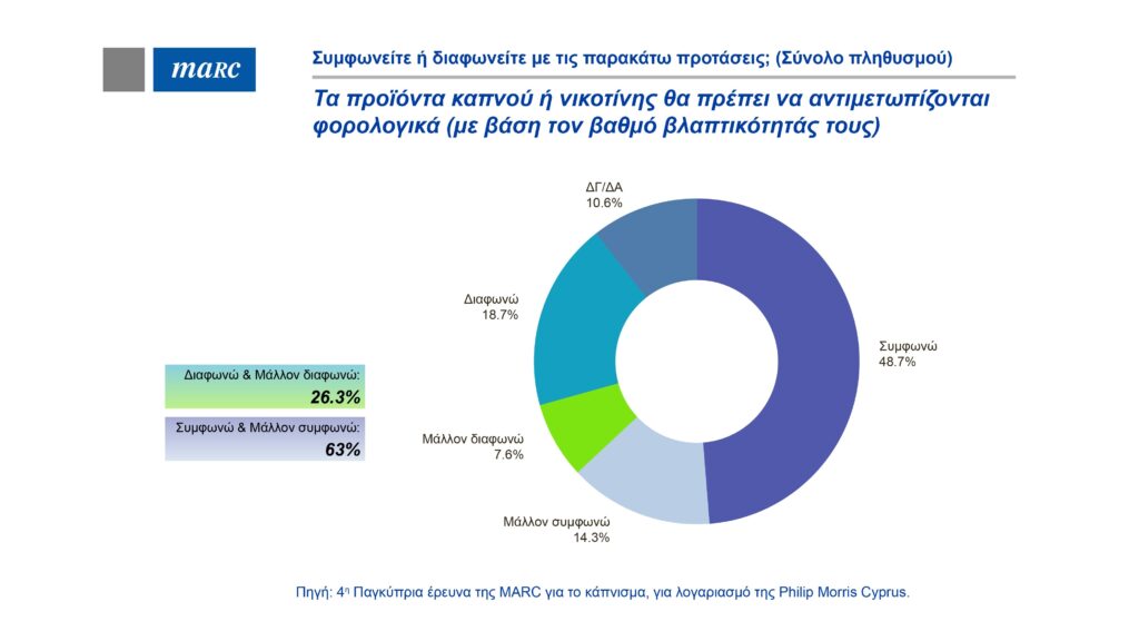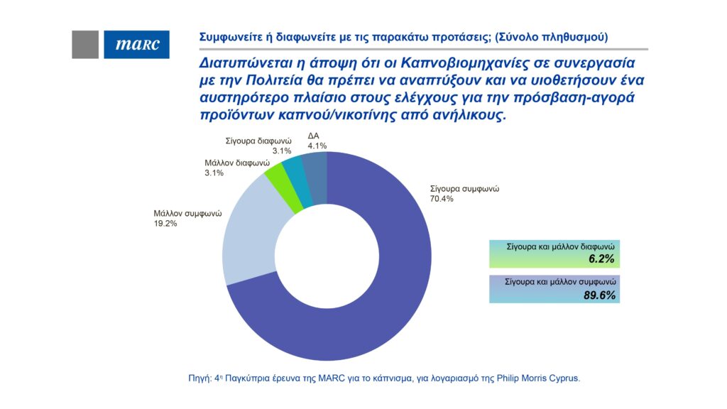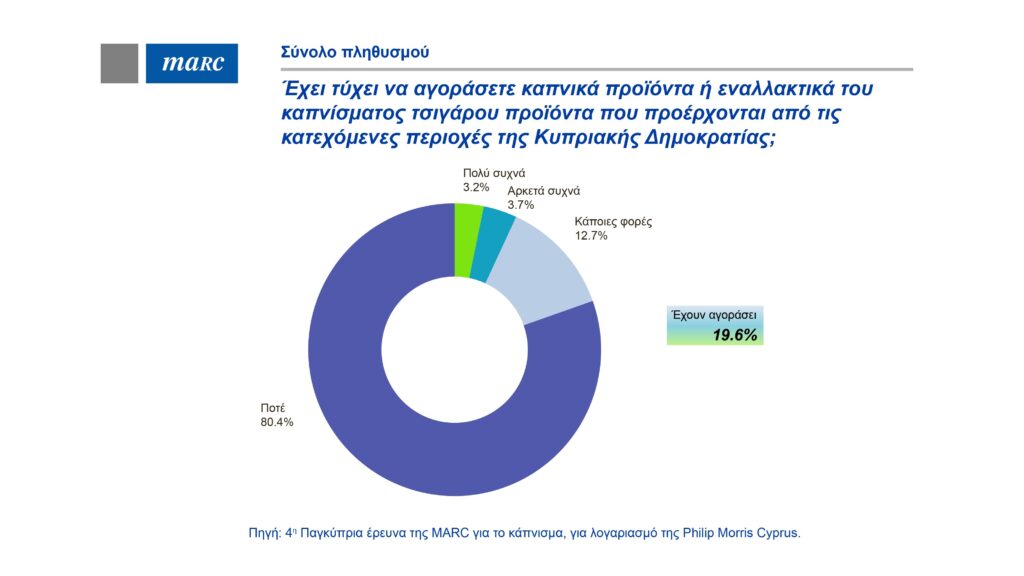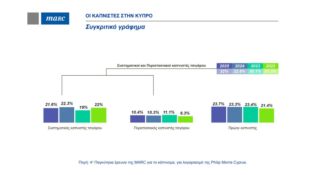 Δύο κρίσιμες προκλήσεις για την κοινωνία αναδεικνύει η 4η Παγκύπρια Έρευνα για τις Καπνικές Συνήθειες, που πραγματοποιήθηκε από τη MARC για λογαριασμό της Philip Morris Cyprus: το παράνομο εμπόριο καπνικών προϊόντων και η πρόσβαση ανηλίκων σε προϊόντα καπνού και νικοτίνης. Τα ευρήματα της έρευνας, που διεξήχθη το διάστημα 9–15 Οκτωβρίου 2025 σε 800 νοικοκυριά, αναδεικνύουν την ανάγκη για συντονισμένη δράση της Πολιτείας, των αρμόδιων Αρχών και του ιδιωτικού τομέα, ώστε να αντιμετωπιστούν αποτελεσματικά οι σύγχρονες προκλήσεις γύρω από το κάπνισμα. Οι απαντήσεις των πολιτών τονίζουν την ανάγκη για πιο αυστηρούς ελέγχους και διασφάλιση της προστασίας των νέων και της κοινωνίας συνολικά, μέσα από συνεχή ενημέρωση και ευαισθητοποίηση.