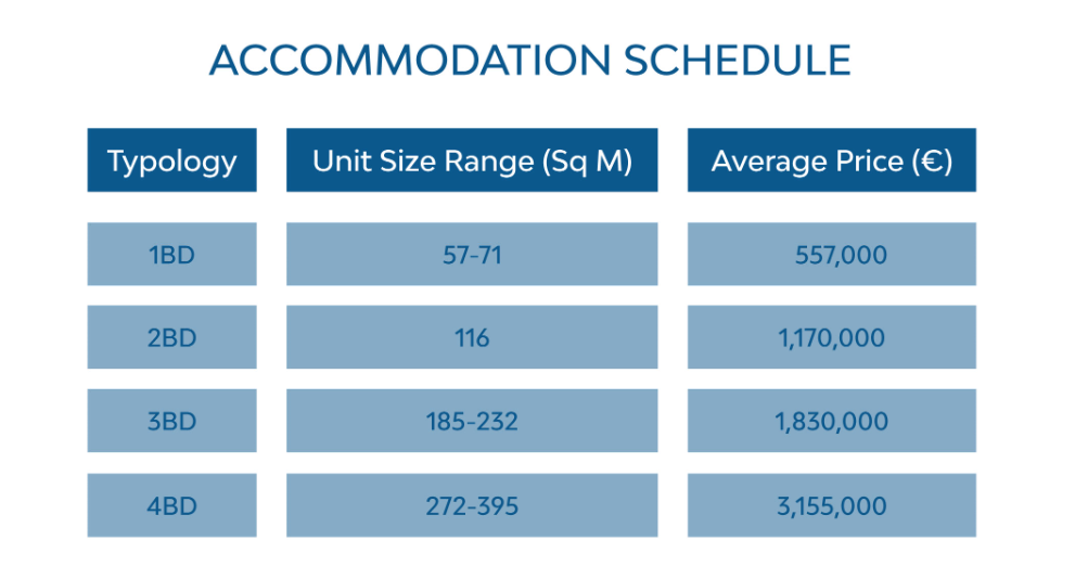 Οι τιμές αγοράς ξεκινούν από €485.000 και φτάνουν έως τα €4,5 εκατομμύρια, ενώ οι τιμές ανά τ.μ. κυμαίνονται μεταξύ €6.985 και €12.500, ανάλογα με το κτίριο και την τυπολογία.