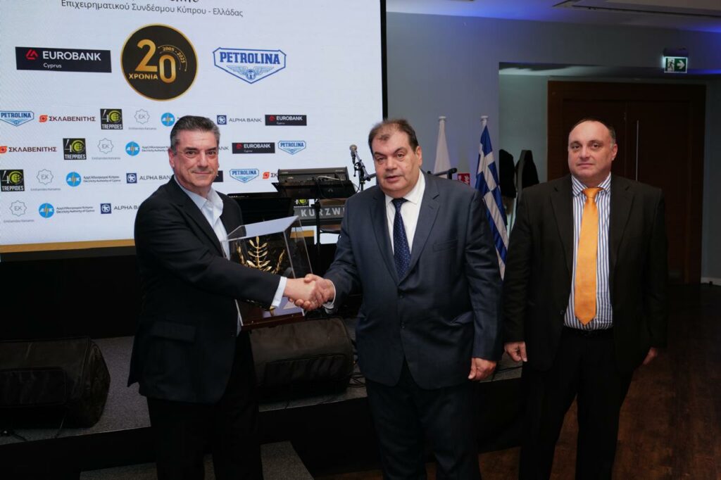 Ο Επιχειρηματικός Σύνδεσμος Κύπρου–Ελλάδας βράβευσε την Eurobank και την Πετρολίνα για τις στρατηγικές επενδύσεις τους, οι οποίες συμβάλλουν στη διεύρυνση των επιχειρηματικών σχέσεων των δύο χωρών. Η απονομή των τιμητικών πλακετών πραγματοποιήθηκε στο πλαίσιο του ετήσιου Επιχειρηματικού Δείπνου του Συνδέσμου, το οποίο φέτος είχε και επετειακό χαρακτήρα λόγω της συμπλήρωσης 20 χρόνων δράσης.