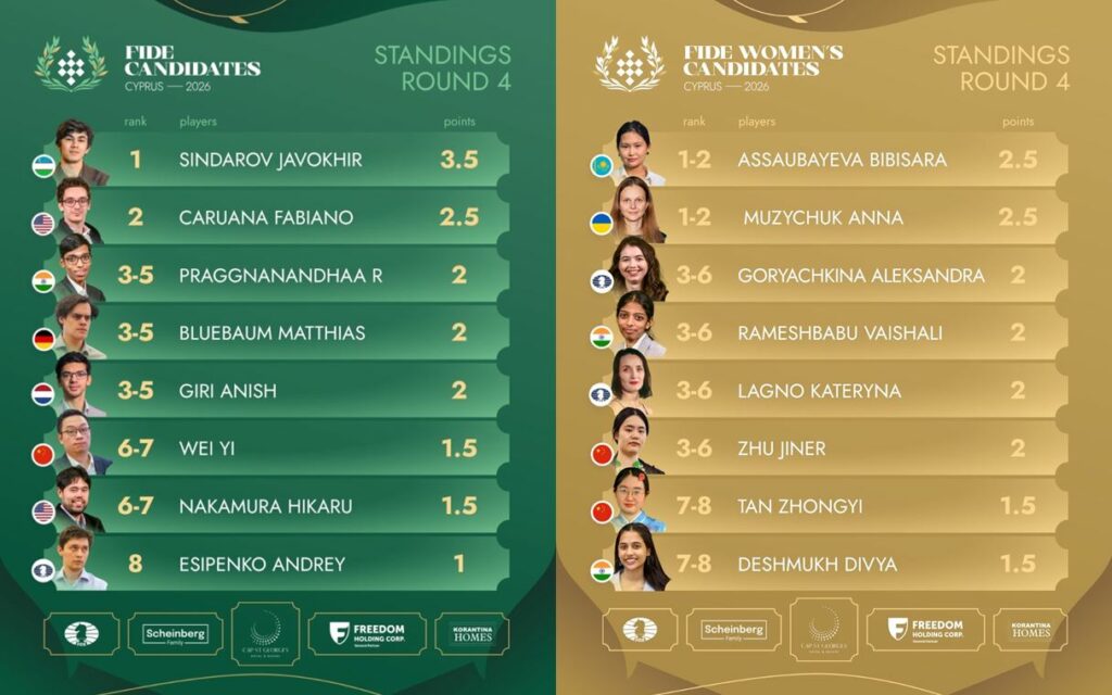 Τέσσερις γύροι έχουν ήδη ολοκληρωθεί στο Τουρνουά Διεκδικητών, που διεξάγεται στο Cap St Georges Hotel στην Κύπρο. Στην κατηγορία των ανδρών, ο 20χρονος grandmaster Javokhir Sindarov από το Ουζμπεκιστάν προηγείται, έχοντας σημειώσει τρεις εντυπωσιακές νίκες. Στην κατηγορία των γυναικών, η Bibisara Assaubayeva και η Anna Muzychuk μοιράζονται την πρώτη θέση, έχοντας από μία νίκη η καθεμία. Η 2η Απριλίου είναι ημέρα ανάπαυσης, ενώ απομένουν ακόμη 10 γύροι.Andrey
