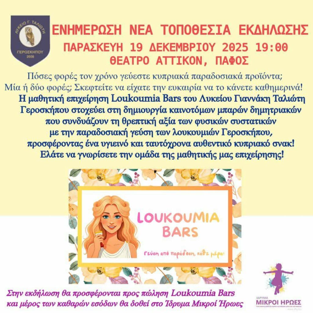 Το κοινό καλείται να γνωρίσει από κοντά την ομάδα της μαθητικής επιχείρησης. Στο πλαίσιο της εκδήλωσης θα διατίθενται προς πώληση Loukoumia Bars, ενώ μέρος των καθαρών εσόδων θα διατεθεί στο Ίδρυμα Μικροί Ήρωες.