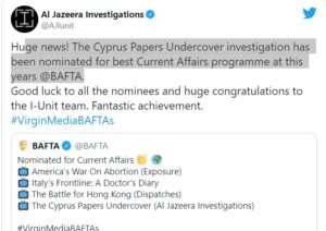 Η έρευνα και τα βίντεο του Al Jazeera που αφορούσαν το Κυπριακό Επενδυτικό Πρόγραμμα είναι υποψήφια για βράβευση από τα Βραβεία Βρετανικής Ακαδημίας Κινηματογράφου γνωστά...