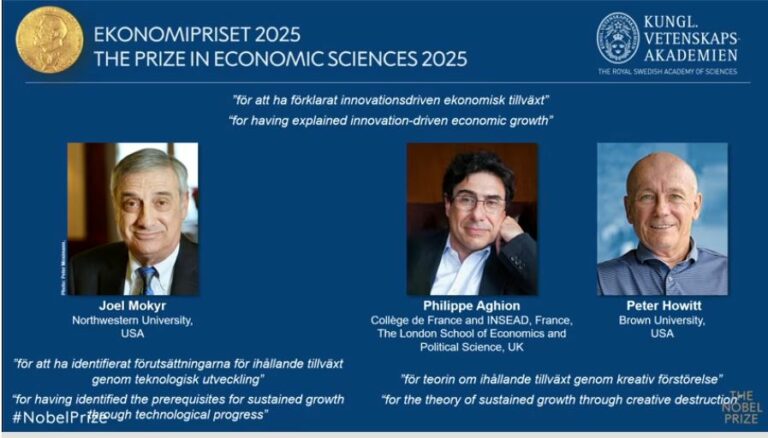 Η Βασιλική Σουηδική Ακαδημία Επιστημών απένειμε τη Δευτέρα το Νόμπελ Οικονομικών Επιστημών 2025 στους Joel Mokyr, Philippe Aghion και Peter Howitt για το έργο τους που εξηγεί την οικονομική ανάπτυξη που βασίζεται στην καινοτομία.