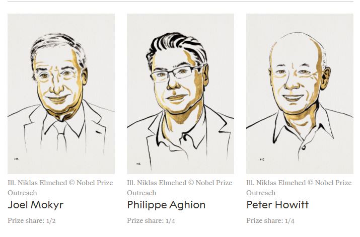 Σύμφωνα με την ανακοίνωση, οι τρεις οικονομολόγοι τιμώνται «για την εξήγηση της ανάπτυξης που καθοδηγείται από την καινοτομία», με το ήμισυ του βραβείου να απονέμεται στον Joel Mokyr «για τον εντοπισμό των προϋποθέσεων της διαρκούς ανάπτυξης μέσω τεχνολογικής προόδου», ενώ το υπόλοιπο μισό απονέμεται από κοινού στους Philippe Aghion και Peter Howitt «για τη θεωρία της διαρκούς ανάπτυξης μέσω της δημιουργικής καταστροφής».