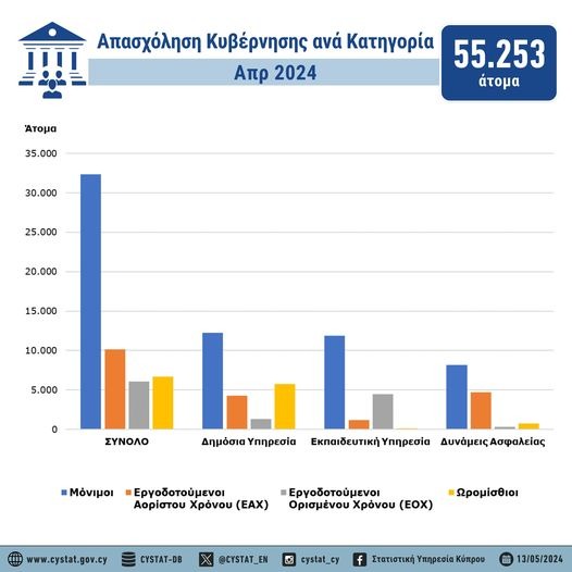 Η απασχόληση στην Κυβέρνηση τον Απρίλιο του 2024 ανήλθε στα 55.253 άτομα σύμφωνα με τα στοιχεία που ανακοίνωσε η Στατιστική Υπηρεσία.