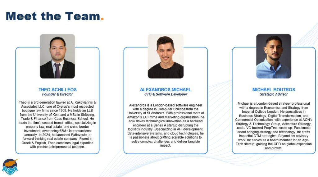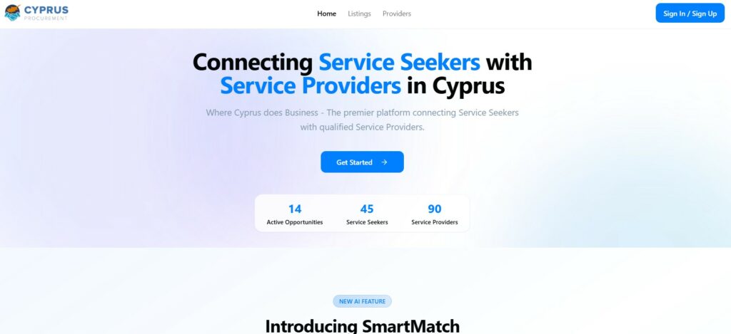 Η τεχνητή νοημοσύνη είναι στον πυρήνα της πλατφόρμας. Μέσα από το SmartMatch βρίσκονται οι καταλληλότεροι πάροχοι για κάθε ανάγκη, γρήγορα και στοχευμένα. Επιπλέον, η ομάδα μας έχει την τεχνογνωσία να αξιοποιήσει AI και σε άλλους τομείς, όπως νομικά και λογιστικά ζητήματα, αλλά και να αναπτύξει μελλοντικές λύσεις με πρακτική εφαρμογή στην κυπριακή αγορά.