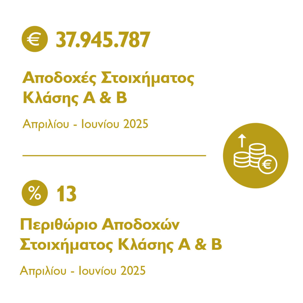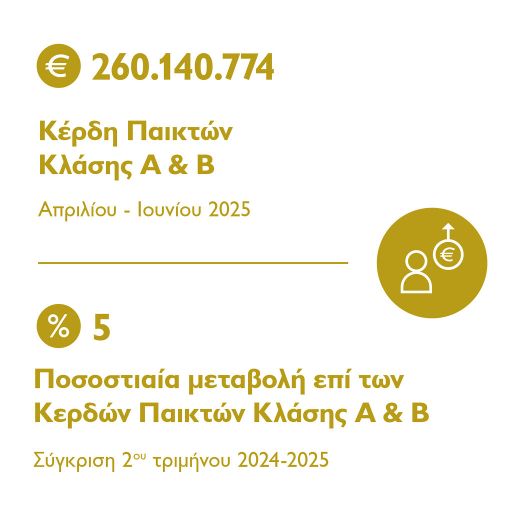 Τα κέρδη παικτών για τις δύο κατηγορίες ανήλθαν σε €260,1 εκατ., αυξημένα κατά 5% έναντι του 2024 και κατά 14% σε σύγκριση με το 2023. Η Κλάση Β καταλαμβάνει το μεγαλύτερο μέρος των κερδών, με €200,4 εκατ..