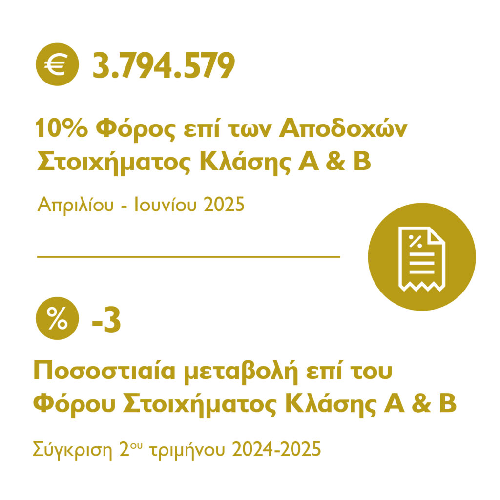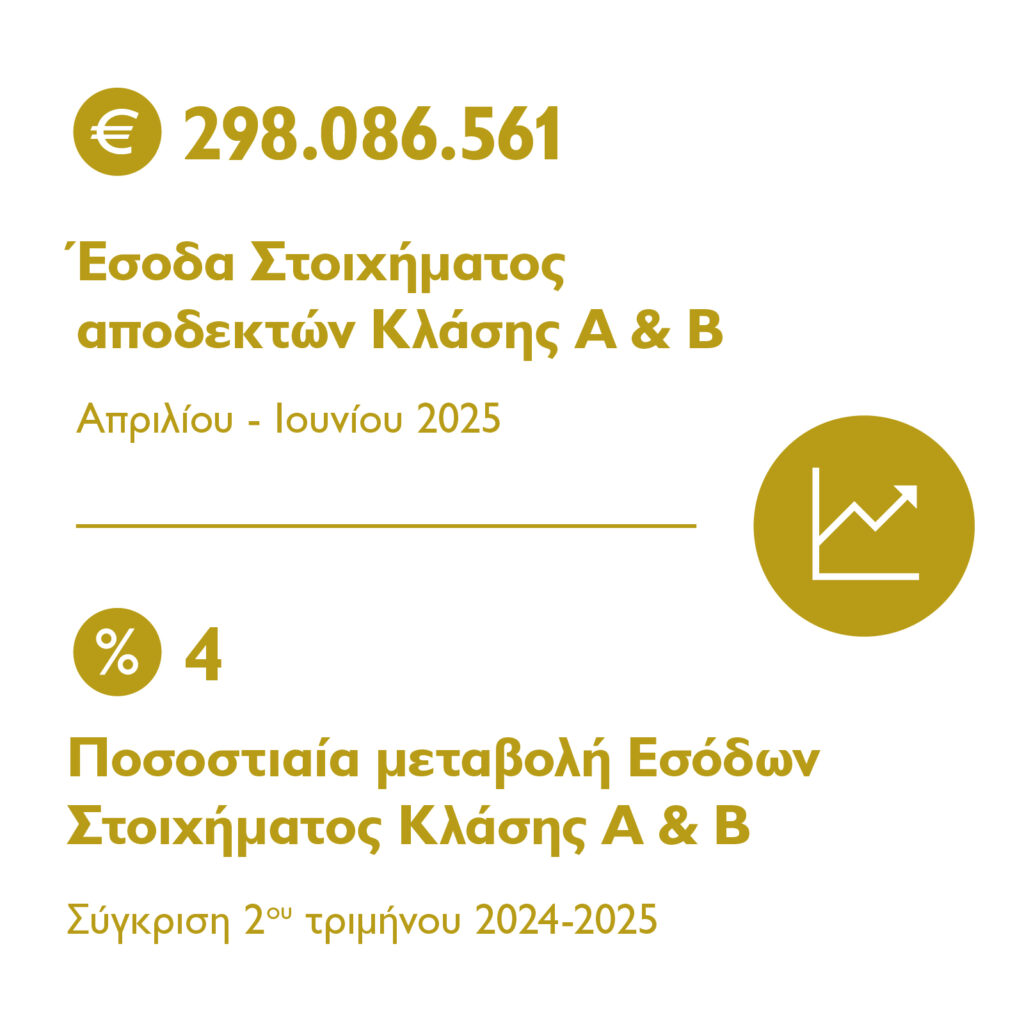 Από το σύνολο των εσόδων, €73,9 εκατ. προήλθαν από την Κλάση Α και €224,2 εκατ. από την Κλάση Β. Τα έσοδα της Κλάσης Α μειώθηκαν κατά 3% έναντι του 2024, αλλά αυξήθηκαν κατά 3% σε σχέση με το 2023, ενώ η Κλάση Β ενισχύθηκε κατά 6% και 21%, αντίστοιχα.