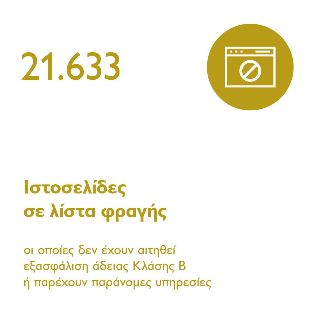 Η ΕΑΣ συνεχίζει τις προσπάθειες εντοπισμού και φραγής παράνομων ιστοσελίδων στοιχήματος. Το Β’ τρίμηνο του 2025, η σχετική λίστα έφτασε τις 21.633 ιστοσελίδες, με 322 νέες προσθήκες – αύξηση 6% σε σχέση με το 2024.
