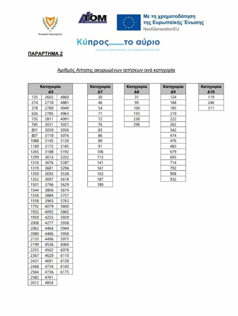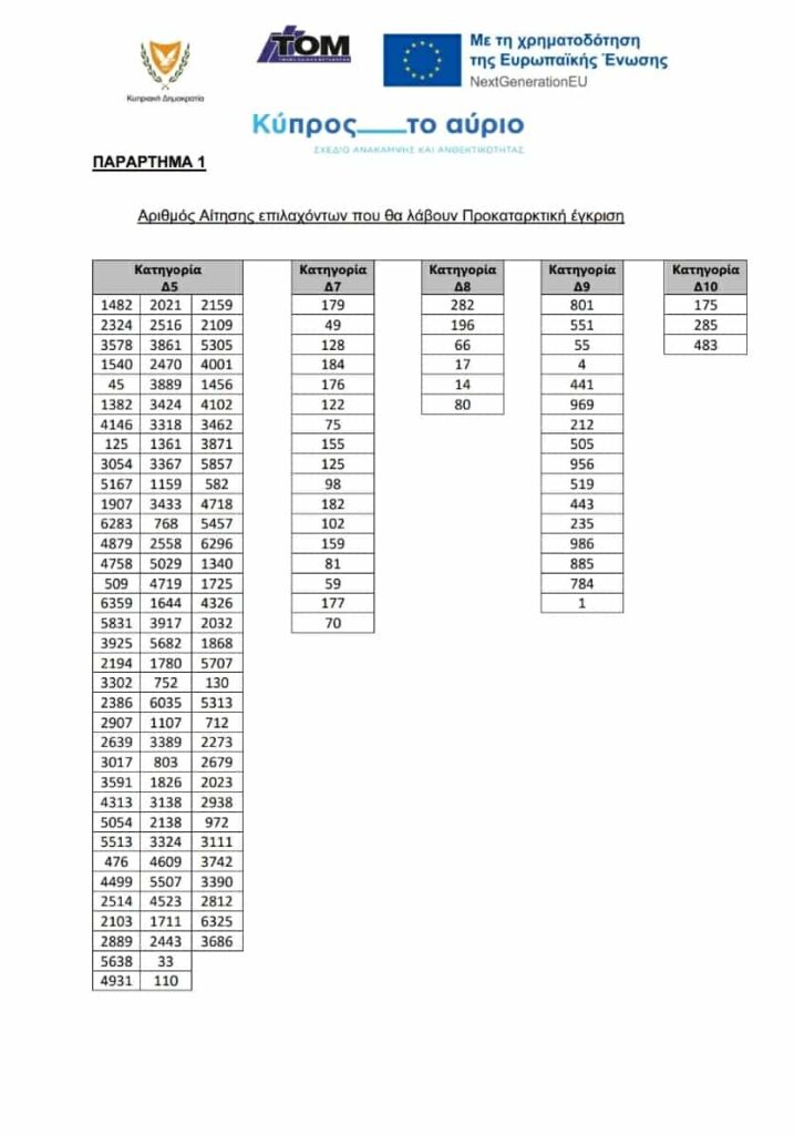 Πιο συγκεκριμένα για τις πάνω κατηγορίες χορηγίας παρατίθενται πιο κάτω οι αριθμοί αίτησης μέχρι τους οποίους θα σταλεί προκαταρκτική έγκριση σε επιλαχόντες (σχετική κατάσταση επισυνάπτεται στο Παράρτημα 1), για την ανάρτηση παραγγελίας (καινούργια οχήματα) ή αποστολή παραγγελίας (μεταχειρισμένα οχήματα), εντός της καθορισμένης προθεσμίας που θα ορίζεται στο μήνυμα της έγκρισης: