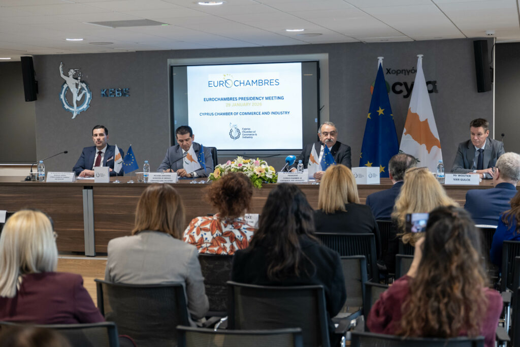Η ανταγωνιστικότητα της Ευρωπαϊκής Ένωσης βρέθηκε στο επίκεντρο της Προεδρικής Συνάντησης των Ευρωεπιμελητηρίων, η οποία πραγματοποιήθηκε στα γραφεία του ΚΕΒΕ στη Λευκωσία, συγκεντρώνοντας ανώτατα στελέχη του δικτύου των Ευρωπαϊκών Επιμελητηρίων και υψηλόβαθμους αξιωματούχους της Κυπριακής Δημοκρατίας. Η συνάντηση πραγματοποιήθηκε λιγότερο από έναν μήνα μετά την έναρξη της Κυπριακής Προεδρίας του Συμβουλίου της ΕΕ, προσφέροντας πλατφόρμα ουσιαστικού διαλόγου για τις ευρωπαϊκές προτεραιότητες ανταγωνιστικότητας.