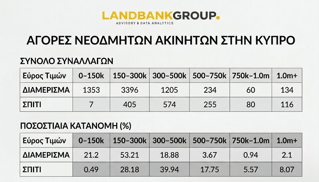 Τις επιλογές των αγοραστών καινούργιων σπιτιών και διαμερισμάτων, όπως αυτές διαμορφώνονται με βάση την αγοραστική τους δύναμη, αντικατοπτρίζει η ανάλυση της Landbank Analytics, η οποία εστιάζει στα πωλητήρια έγγραφα, τα οποία κατατέθηκαν στο Τμήμα Κτηματολογίου και Χωρομετρίας το 2025. Πρόκειται για πωλήσεις υπό ανέγερση ή στα σχέδια (off Plan) καινούργιων διαμερισμάτων και οικιών Παγκύπρια.