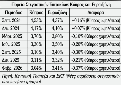 Τα δεδομένα για τις αρχές του 2026 επιβεβαιώνουν ότι η Κύπρος έχει εδραιωθεί ανάμεσα στις χώρες με τα χαμηλότερα στεγαστικά επιτόκια στη ζώνη του ευρώ. Σύμφωνα με τα τελευταία στοιχεία της Κεντρικής Τράπεζας Κύπρου, το μέσο επιτόκιο νέων στεγαστικών δανείων διαμορφώθηκε στο 3,04% τον Φεβρουάριο του 2026, έναντι μέσου όρου Ευρωζώνης 3,41%. Αξιοσημείωτο είναι το γεγονός ότι ο σταθμισμένος μέσος όρος στην Κύπρο υποχώρησε ελαφρώς από 3,11% τον Δεκέμβριο του 2025 σε 3,04% τον Φεβρουάριο του 2026, ενώ ο μέσος όρος της Ευρωζώνης κινήθηκε αντίθετα, ανερχόμενος από 3,32% σε 3,41%. Η ψαλίδα, δηλαδή, δεν παραμένει σταθερή αλλά διευρύνεται.
