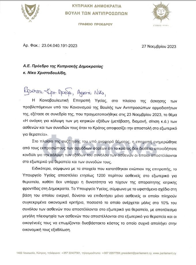 Επιστολή στον Πρόεδρο της Δημοκρατίας, Νίκο Χριστοδουλίδη, απέστειλε η Πρόεδρος της Βουλής, Αννίτα Δημητρίου, μέσω της οποίας διαβίβασε την παράκληση της Επιτροπής Υγείας, όπως η Κυβέρνηση περιλάβει στον Κρατικό Προϋπολογισμό για το 2024 κονδύλι ύψους 4 εκατομμυρίων ευρώ για κάλυψη των ιατρικών εξόδων των ασθενών και των συνοδών τους, όταν το Κράτος αποφασίζει την αποστολή τους στο εξωτερικό για θεραπεία.