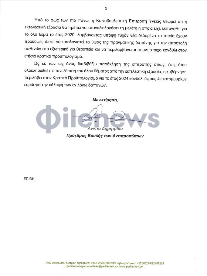 Όπως αναφέρει στην επιστολή της η κ. Δημητρίου, σύμφωνα με τα στοιχεία τα οποία κατατέθηκαν ενώπιον της επιτροπής, το Υπουργείο Υγείας αποστέλλει ετησίως 1.200 περίπου ασθενείς στο εξωτερικό καθώς δεν υπάρχει η δυνατότητα να τύχουν της απαραίτητης ιατρικής φροντίδας στην Κύπρο.