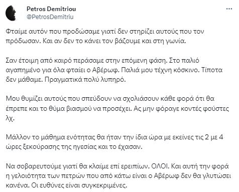 «Σαν έτοιμη από καιρό περάσαμε στην επόμενη φάση. Στο παλιό αγαπημένο για όλα φταίει ο Αβέρωφ. Παλιά μου τέχνη κόσκινο. Τίποτα δεν μάθαμε. Πραγματικά πολύ λυπηρό», έγραψε μεταξύ άλλων ο Πέτρος Δημητρίου.