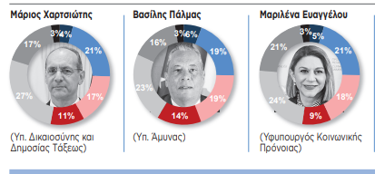 Μάριος Χαρτσιώτης και Βασίλης Πάλμας που ανέλαβαν πρόσφατα τα υπουργεία Δικαιοσύνης και Άμυνας, αντίστοιχα δεν συγκαταλέγονται στους δημοφιλείς υπουργούς του Νίκου Χριστοδουλίδη. Για τον μεν Μ. Χαρτσιώτη τα συν-πλην της δημοτικότητάς του είναι 26-27% και για τον Β. Πάλμα στο 25-33%.