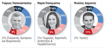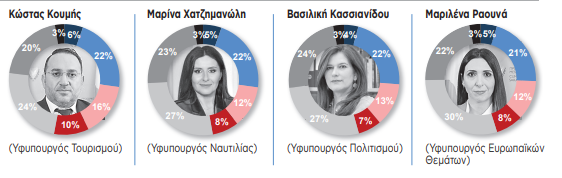 Στα ίδια επίπεδα και η Μαρίνα Χατζημανώλη, που επίσης βρίσκεται στην κυβέρνηση από την πρώτη ημέρα, με ένα 27% συν και 20% πλην.