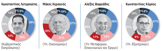 Πιο κάτω βρίσκεται ο υπουργός Μεταφορών, Αλέξης Βαφεάδης με 36% θετικές αξιολογήσεις και 26% αρνητικές. Ο Αλ. Βαφεάδης φαίνεται να κερδίζει πόντους στο χώρο του ΔΗΚΟ.