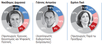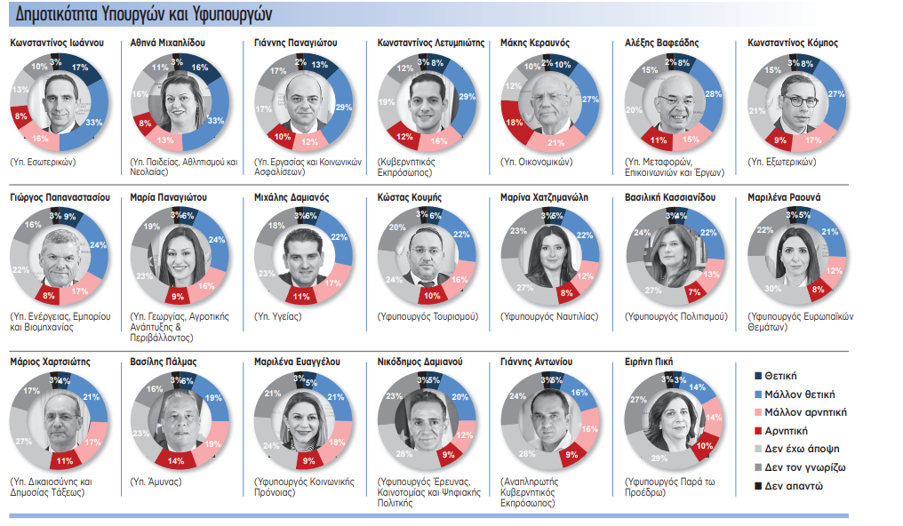 Στον πυθμένα του πίνακα βρίσκεται η υφυπουργός παρά τω Προέδρω, Ειρήνη Πική, η οποία έχει μια δημοτικότητα που φτάνει μόλις στο 17%.