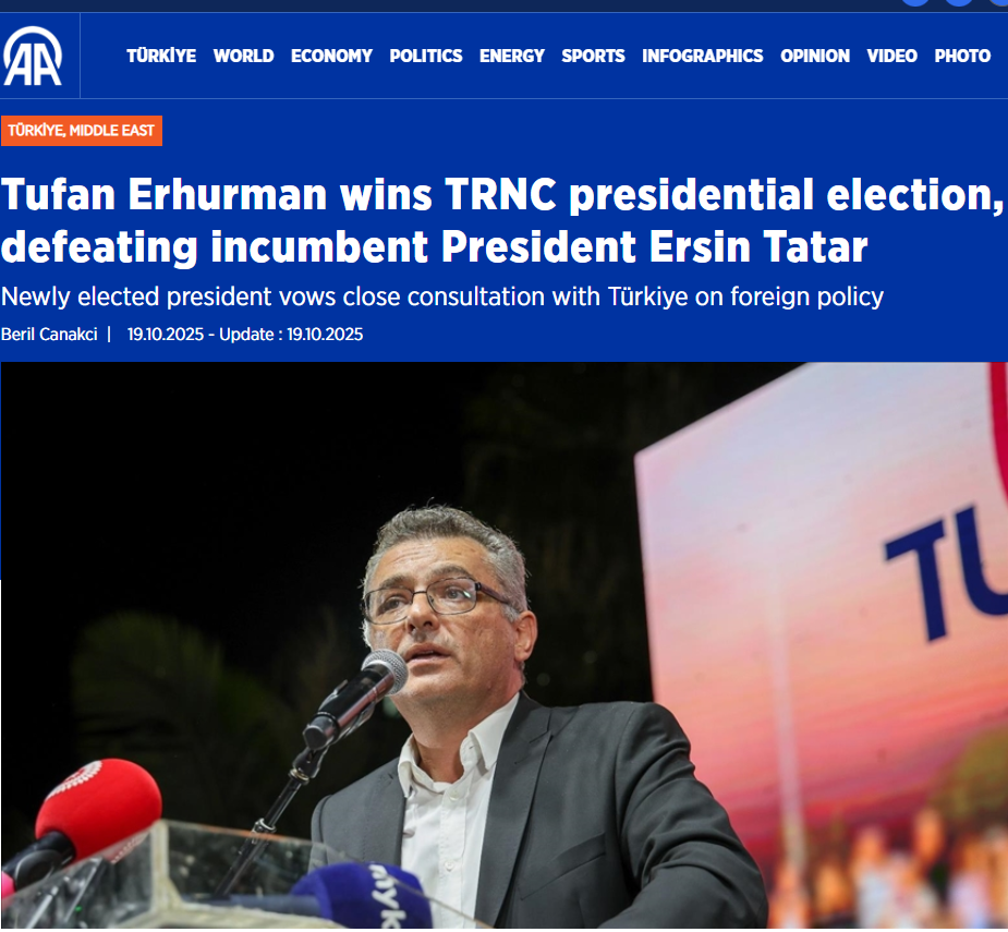 Anadolu Ajansi – «Ο Τουφάν Ερχουρμάν κερδίζει τις προεδρικές εκλογές, νικώντας τον εν ενεργεία πρόεδρο Ερσίν Τατάρ»